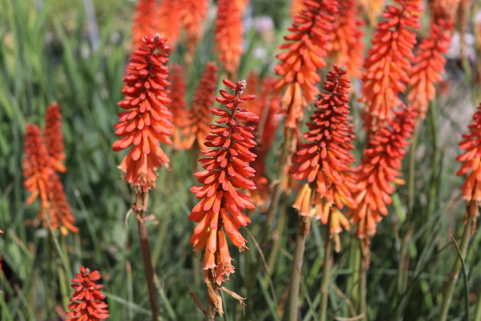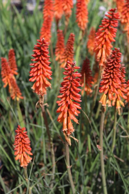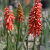 Kniphofia uvaria ‚Echo Rojo‘ zu Deutsch Fackellilie ist eine horstig wachsende Staude für sonnige Standorte. Ihr botanischer Name geht auf den Erfurter Botaniker Johann Hieronymus Kniphof zurück. Die Fackellilie stammt ursprünglich aus Südafrika, wo sie vor allem in den Bergregionen rund um die knapp 3500m hohen Drakensberge zu finden ist. Karge, durchlässige Böden sind für sie kein Problem. Sie verschönert den Garten durch ihre auffälligen Blütenkerzen, die auch im Winter mit ihren Samenständen sehr dekorativ sind.