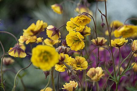 Geum Hybr. ‚Golden Joy‚ bringt Freude ins Beet! Die leuchtenden gold-gelben Blüten dieser Nelkenwurz Sorte sind der Blickfänger in jedem Staudenbeet. Sie sitzen auf dunklen Stielen, die auf bis zu 20cm über dem Blattwerk sitzen können. Nelkenwurze bevorzugen sonnige bis halbschattige Standorte. Sie wachsen besonders gerne in Gehölznähe, aber auch auf Freiflächen oder Rabatten sind denkbare Pflanzsituationen. Generell möchte die Familie der Geum einen Standort, der nie ganz austrocknet und nicht heiß ist. Die farbenfrohen Blüten von ‚Golden Joy‚ sind ein wahrer Insektenmagnet.